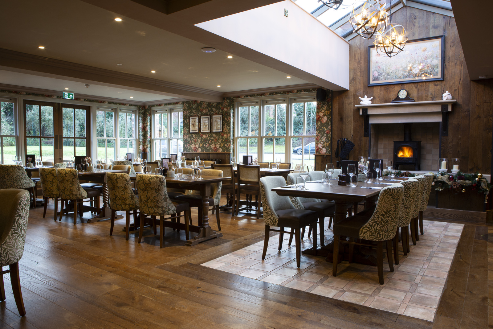 The new extension has been transformed into a bright and airy seating area, thanks to its beautiful glass roof feature. It offers a fresh, modern feel while still echoing the character of the original orangery-style layout.