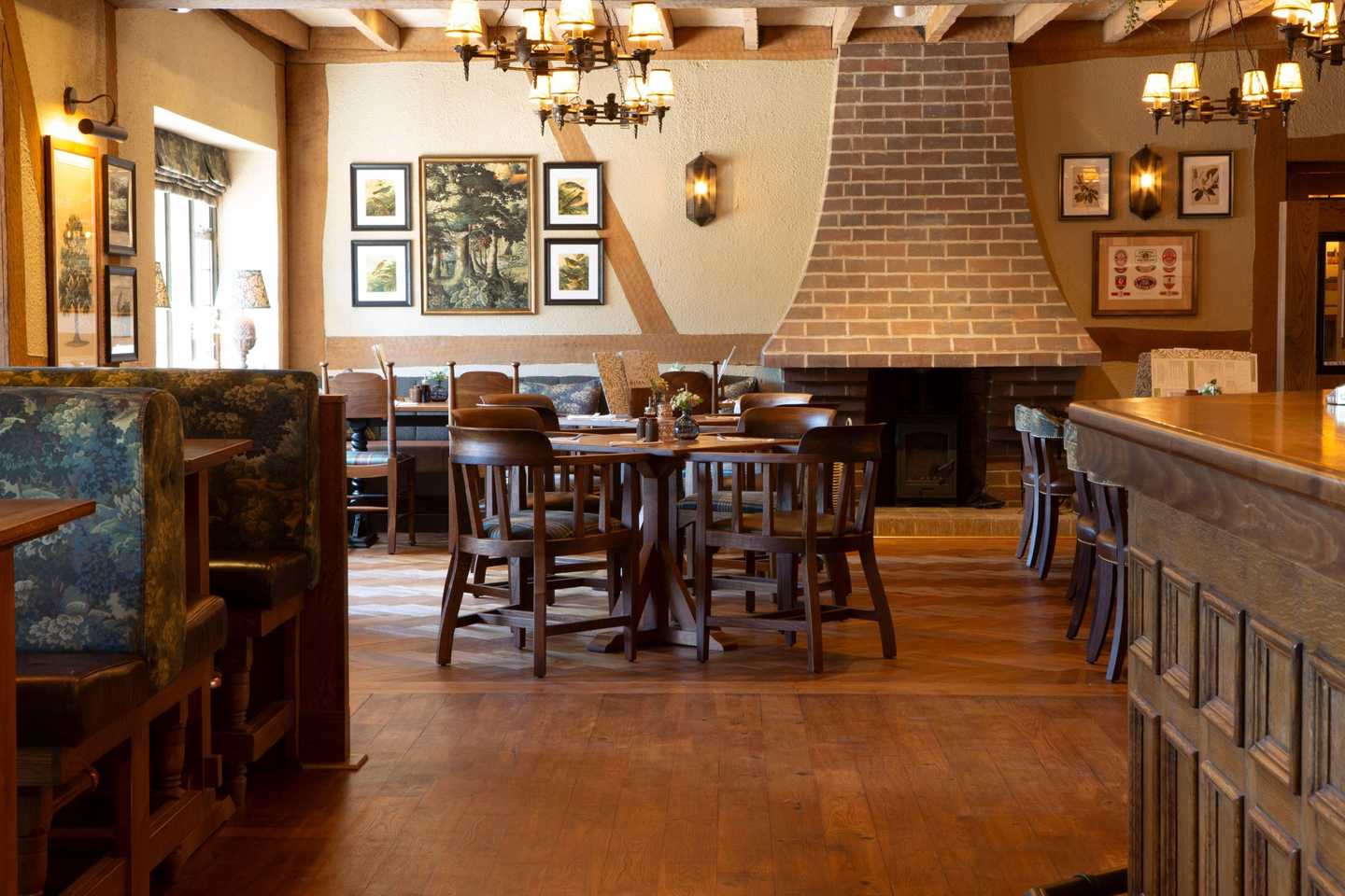 The design approach aimed to highlight and celebrate the building’s heritage rather than alter it. New elements, such as large-scale woodland-themed wallpaper in the bar and corridor areas, were introduced to enhance the existing character and theme without overshadowing it.