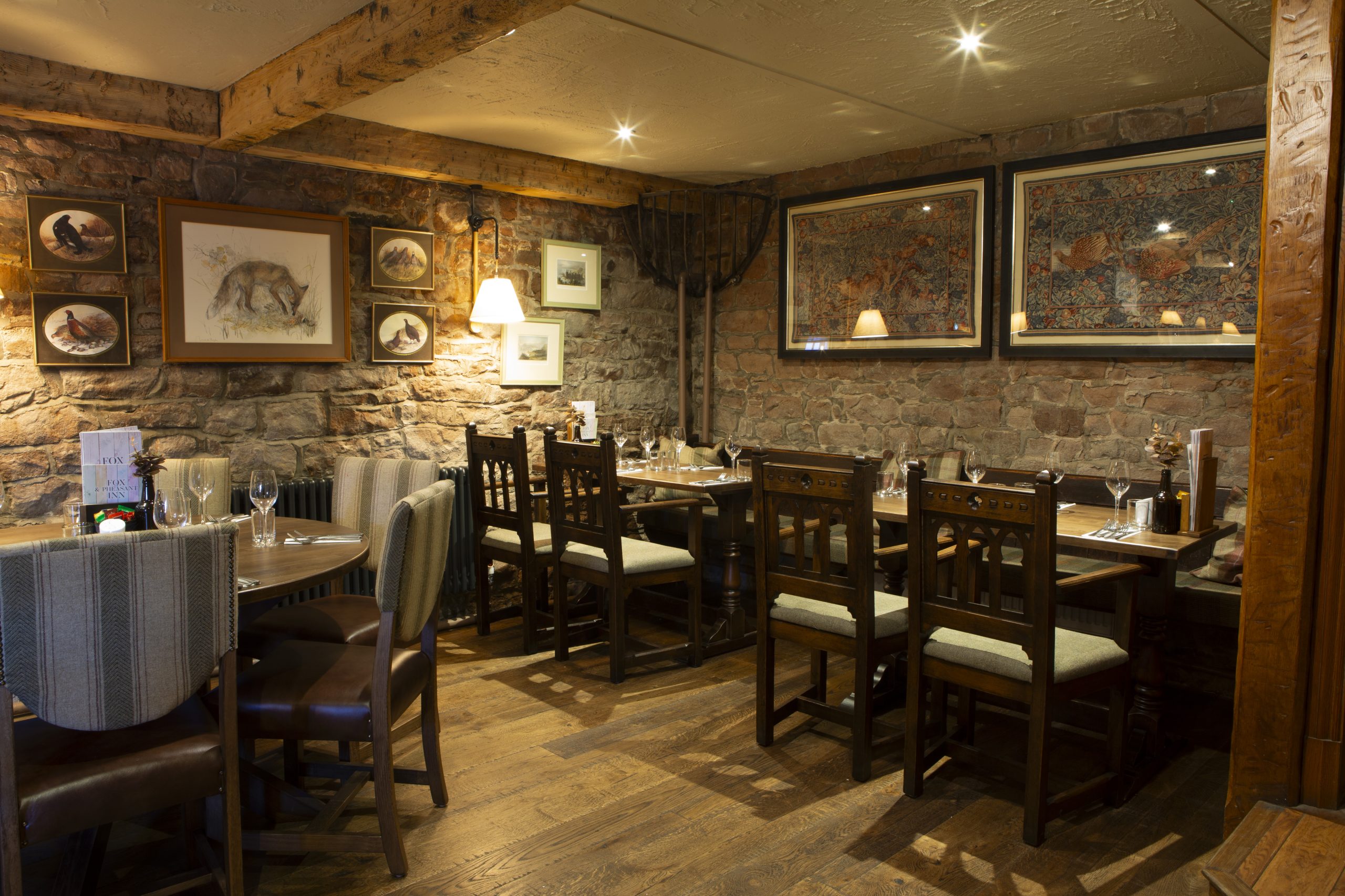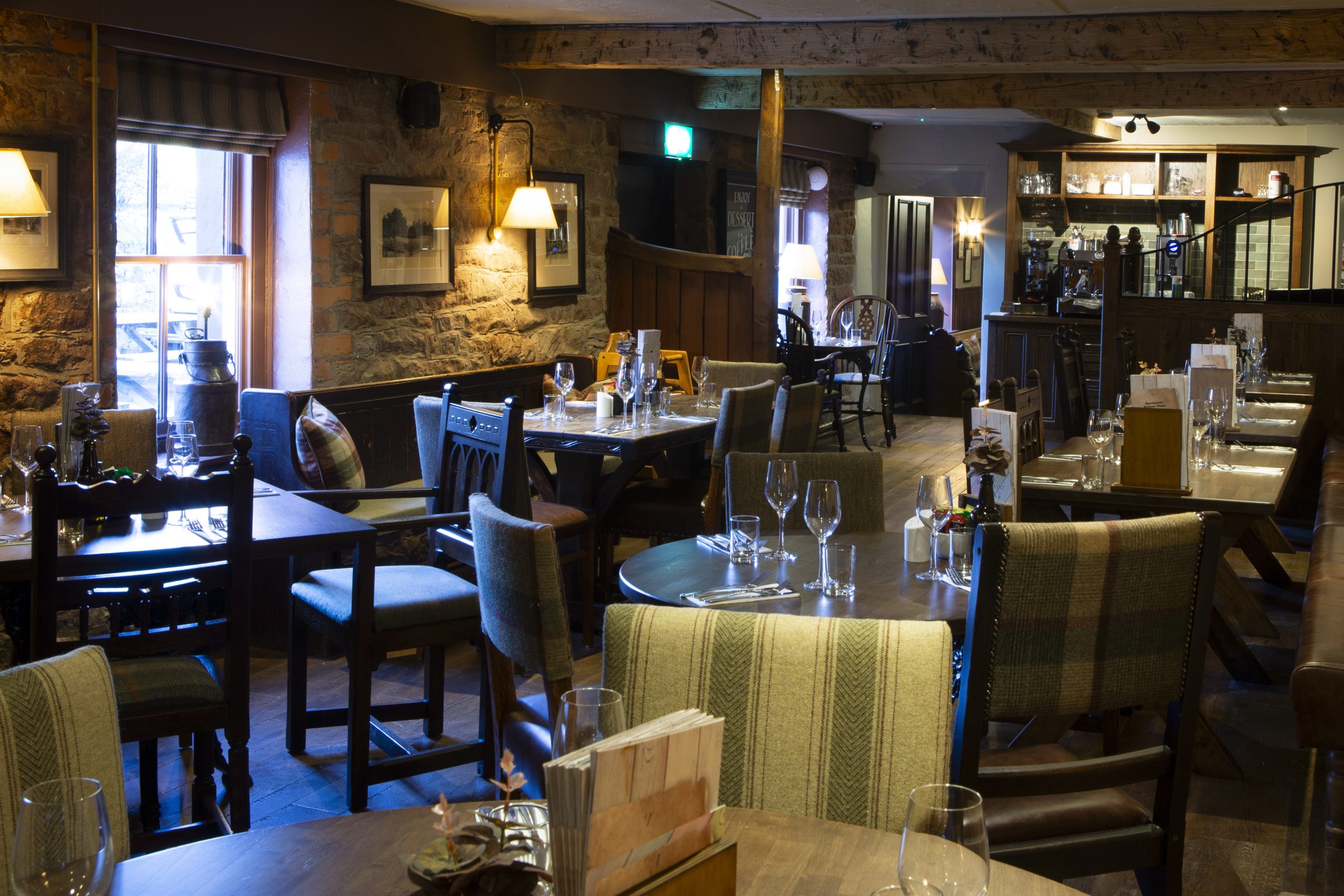 Throughout the pub, the beautiful stonework has been sandblasted and cleaned, revealing a warm colour true to the traditional local [Permian] stone of the village. The wooden beams have also been restored. Areas that were previously carpeted have been fitted with timber flooring, while the original stone floor in the bar has been retained, cleaned and refreshed.